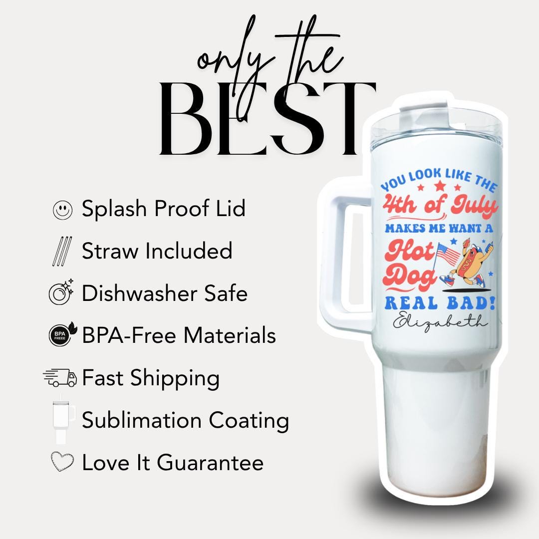 4th of July Hot Dog Personalized Tumbler 40 oz USA Mug w/ Lid & Straw Custom Patriotic Iced Coffee Travel Cup BBQ Mug Perfect Tumbler Gift