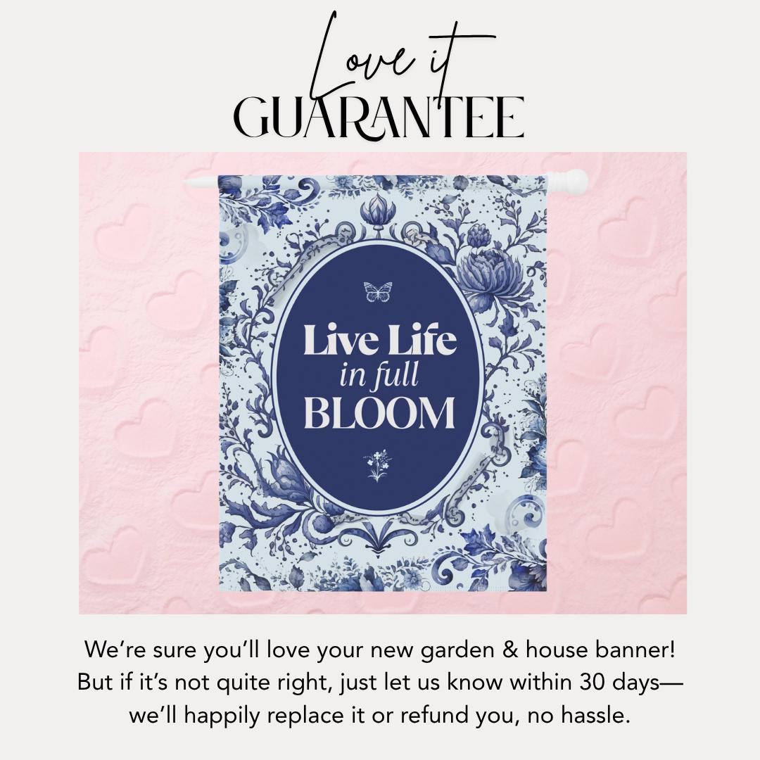 Bring timeless charm and daily inspiration to your home with our Optimistic Gifts Co Live Life in Full Bloom blue floral house banner! π Featuring an elegant vintage-inspired flower design and a heartwarming quote in bold navy tones, this 24.5" x 32" double-sided flag is crafted from 100% durable poplin-canvas with a black inner lining for extra quality. π‘