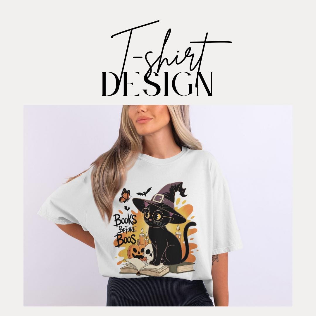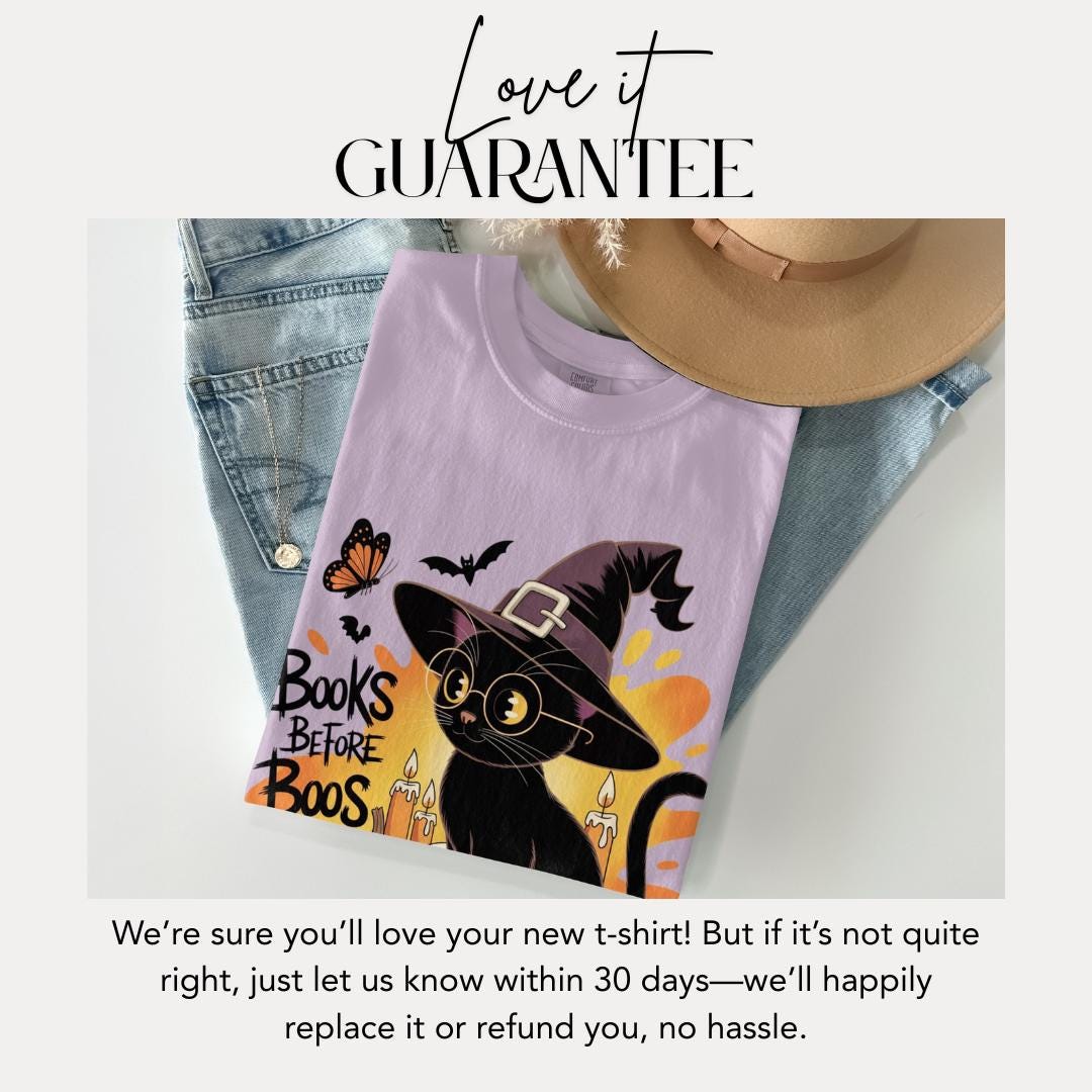 Books Before Boos T-Shirt Cute Halloween Black Cat Witch Graphic Tee Spooky Season Book Lover Gift Literary Halloween Shirt Bookworm Tee