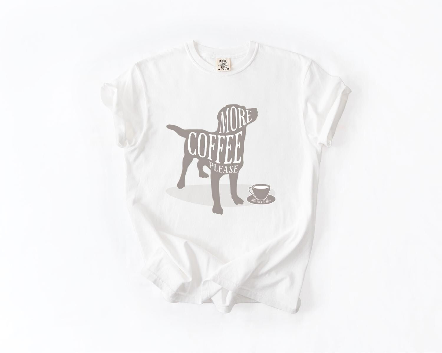 Start your day right with this stylish Optimistic Tees Co Customized Comfort Colors adorable More Coffee Please tee! Featuring a playful dog silhouette filled with bold typography, this cozy white shirt is perfect for coffee addicts and dog lovers alike.