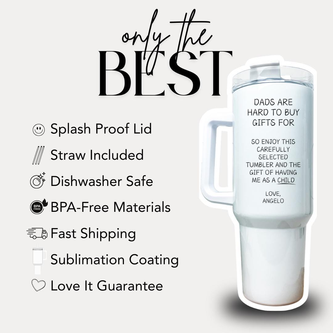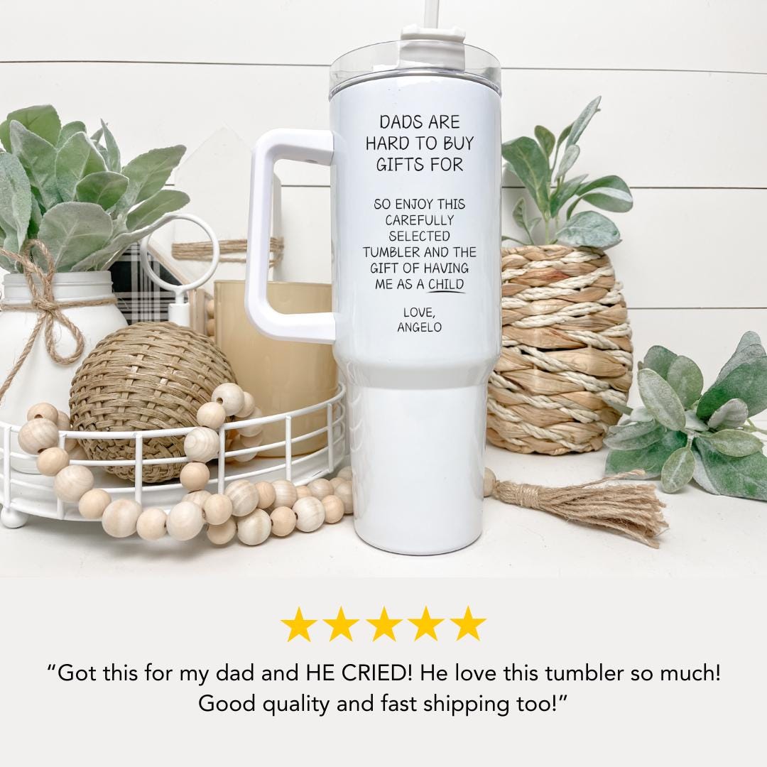 "Dads are hard to buy gifts for, so enjoy this carefully selected tumbler and the gift of having me as a child."