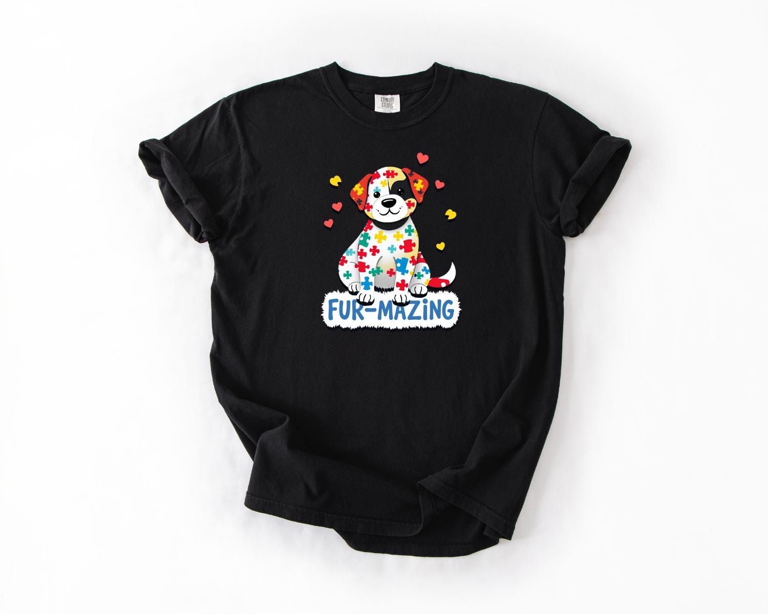 Celebrate love, acceptance, and support with this stylish Optimistic Tees Co Customized Comfort Colors t-shirt our Fur-Mazing Autism Awareness T-Shirt! This adorable design features a cute puppy covered in colorful puzzle pieces, symbolizing the beauty of neurodiversity. Whether you‘re a pet lover, an autism advocate, or looking for the perfect gift, this shirt is a heartwarming way to spread awareness.