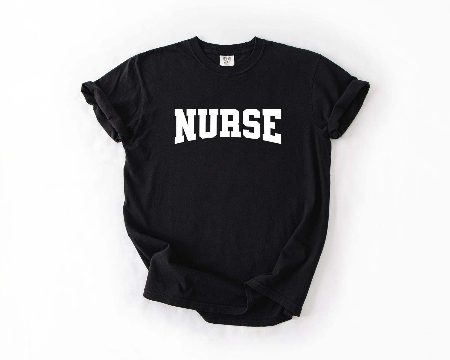 Show off your nursing pride with this stylish Optimistic Tees Co Customized Comfort Colors t-shirt and comfortable varsity-style "NURSE" t-shirt! Designed with a bold collegiate font, this premium-quality unisex tee is perfect for nurses, nursing students, and healthcare professionals. Whether you‘re at work, school, or just relaxing, this soft, breathable, and durable t-shirt will keep you comfortable all day long.