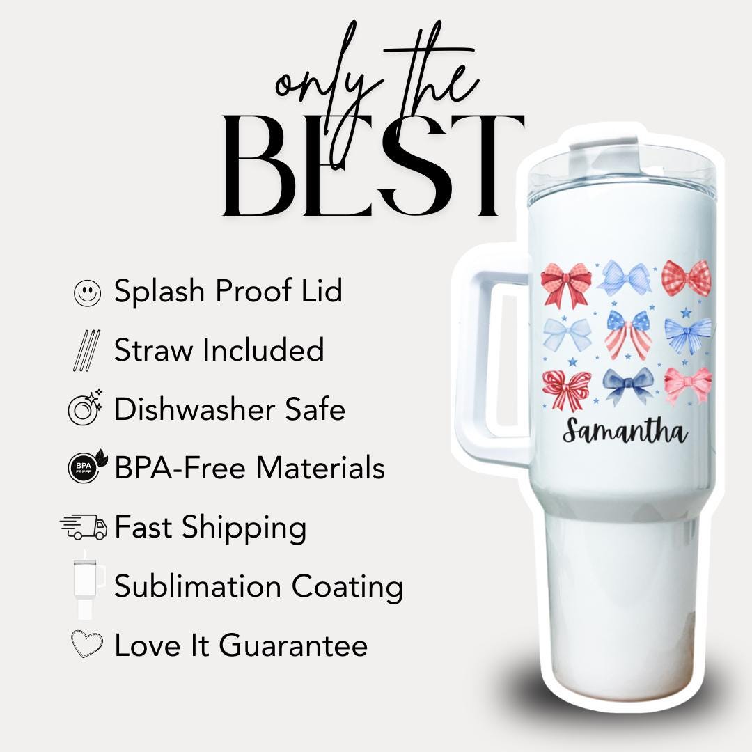 Patriotic Bows Tumbler Custom Name 40 oz Cup Gift with Handle & Straw Cute 4th of July Gift for Women, Girls, Teens Iced Coffee Travel Cup