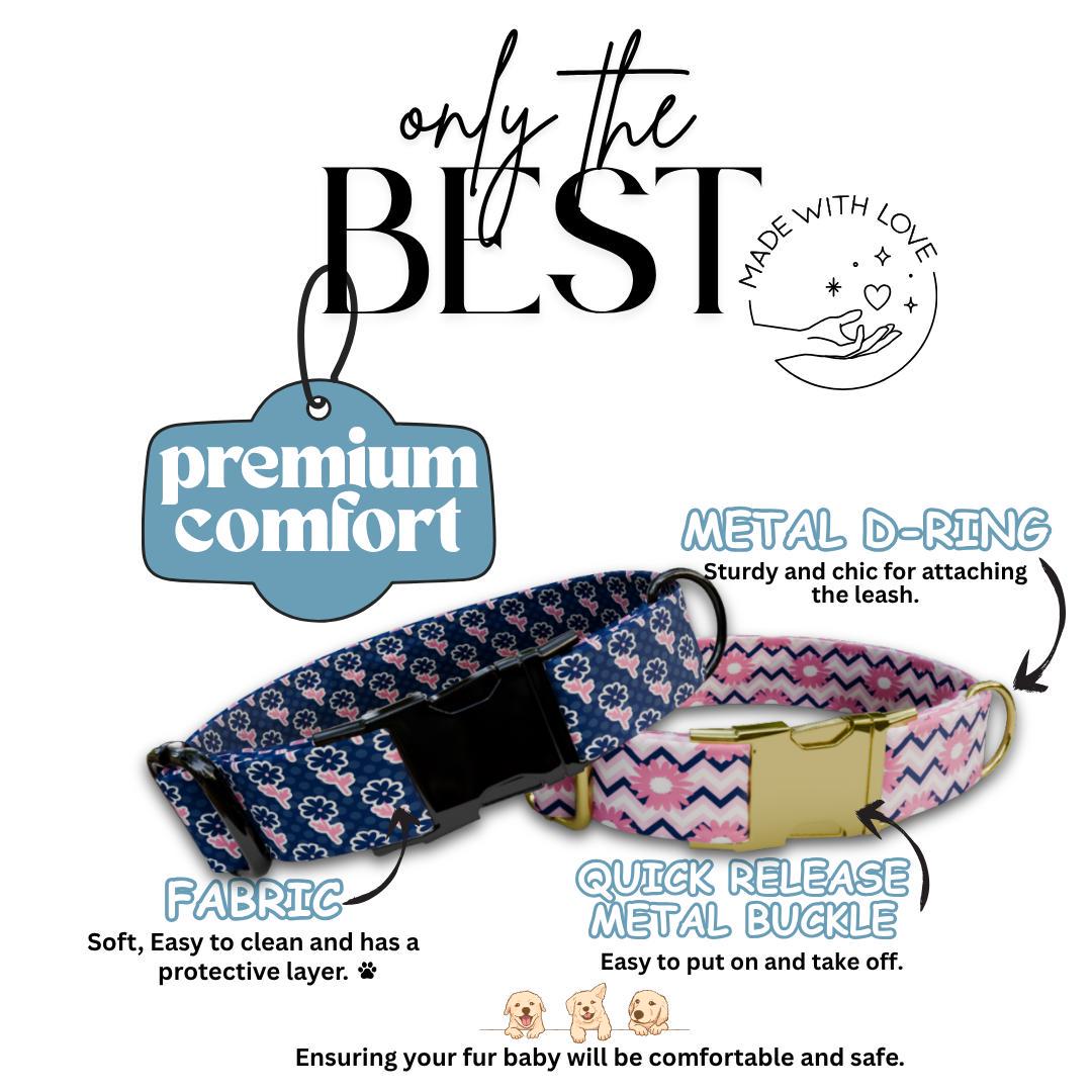 ✨ Choose your buckle color, font style, and pattern — featuring four adorable designs from the “Dog Collar Designs” slide, each combining soft pinks and navy hues with charming prints that pop! Whether your pup is a trendsetter or a snuggle bug, this collar is sure to turn tails wherever you go! 🐶💞