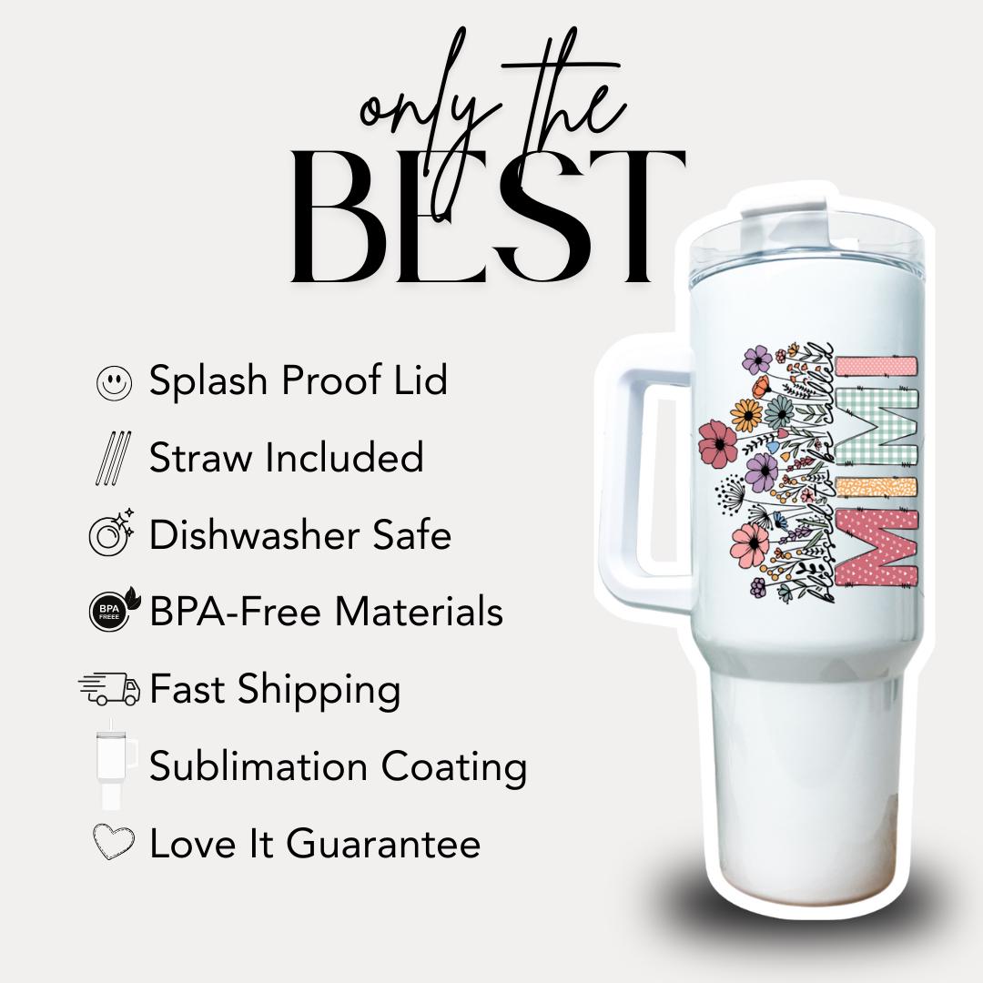 Celebrate the special love of being a MIMI with this beautiful, Optimistic Tees Co. Personalized 40 oz tumbler! Featuring the heartwarming phrase "Blessed to be called MIMI" and a lovely floral design on top of the word MIMI, this tumbler is a perfect gift for the proud grandma in your life - or a sweet treat for yourself.