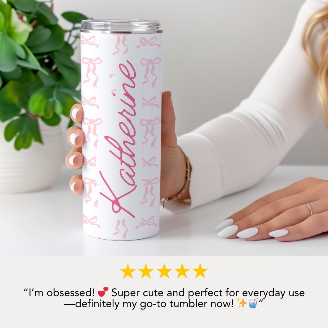 This Optimistic Gifts Co beautiful 20oz stainless steel travel mug features a soft pink design with elegant ribbon tie accents - perfect for everyday use or as a meaningful gift. Whether you're a warrior, survivor, or just love pretty pink drinkware, this cup is designed with love. Customize it with your name for that extra special touch!
