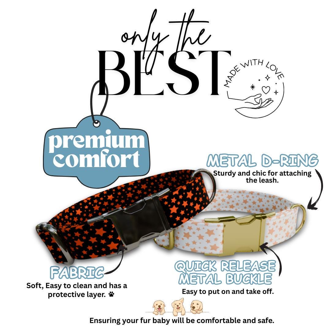 Available in sizes S to XL for the perfect fit, plus you can pick your font and buckle style to make it uniquely yours. Choose from 3 playful starry designs 🌌⭐🧡 that’ll have tails wagging and heads turning wherever you go.