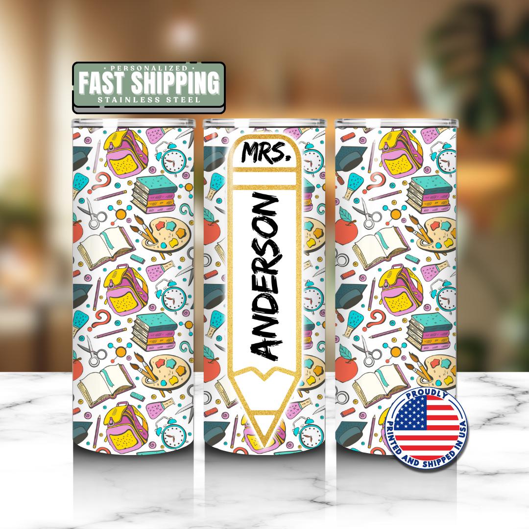 Perfect for showing appreciation or gifting for special occasions, this tumbler is customizable with the teacher’s name inside the pencil graphic 🖍️.