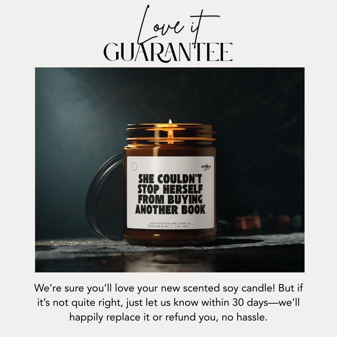 Our Optimistic Gifts Co "She Couldn't Stop Herself From Buying Another Book" Scented Soy Candle is made for all the bookworms who just can't resist "one more" addition to their bookshelf. Crafted with a 100% natural soy wax blend, a cotton wick, and poured into a sleek amber jar, this candle is a perfect combination of humor and cozy vibes. 🕯️