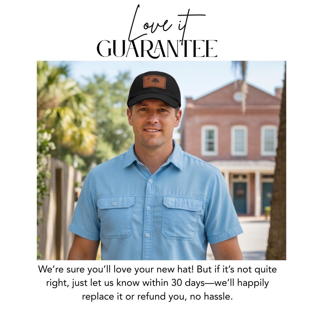 ๐ด๐ Celebrate your South Carolina pride in style! This Optimistic Gifts Co Dad Hat with Leather Patch (Rectangle) features the iconic Palmetto tree and crescent moon from the South Carolina state flag - a timeless symbol of Southern charm, heritage, and coastal spirit. Perfect for locals, travelers, or anyone who loves the Palmetto State.