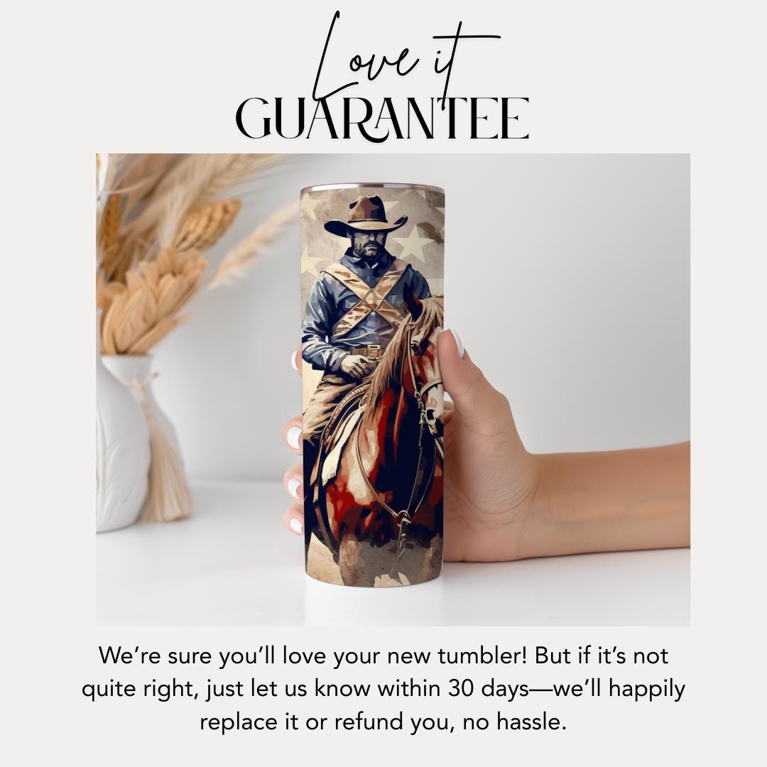 🤠 High-quality 20oz stainless steel tumbler. Vibrant cowboy + American flag artwork