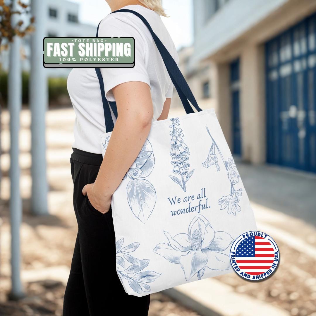 This Optimistic Gifts Co 18x18" tote is more than a bag-it's a daily dose of inspiration! Printed with elegant hand-drawn florals and the uplifting message "We are all wonderful", this highly durable polyester tote comes with 5 handle color options to suit your unique style. It's the perfect gift for friends, teachers, coworkers, or for YOU 💕